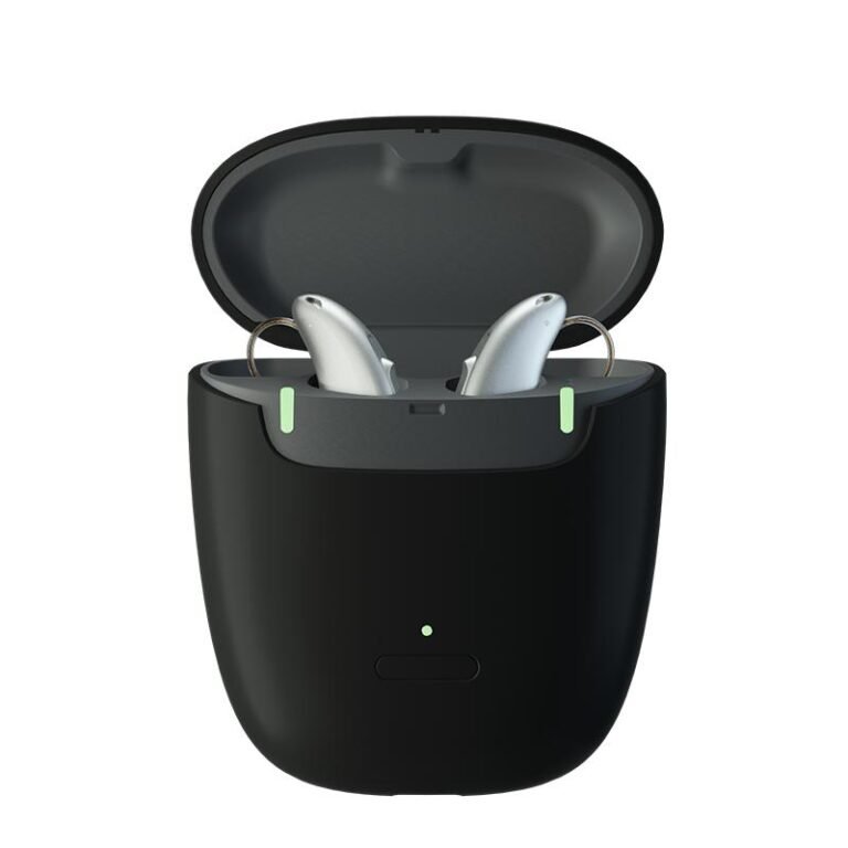Aparelho auditivo com bateria recarregável de longa duração, eliminando a necessidade de troca constante de pilhas.